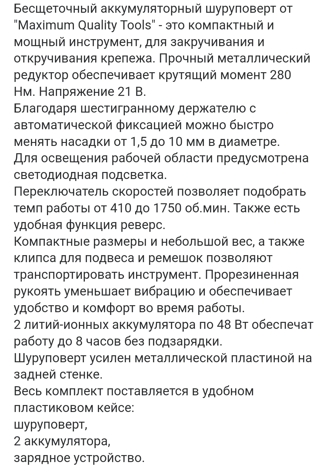Бесщеточный аккумуляторный шуруповерт от "Maximum Quality Tools" - это компактный и мощный инструмент, для закручивания и откручивания крепежа. Прочный металлический редуктор обеспечивает крутящий момент 280 Нм. Напряжение 21 В.