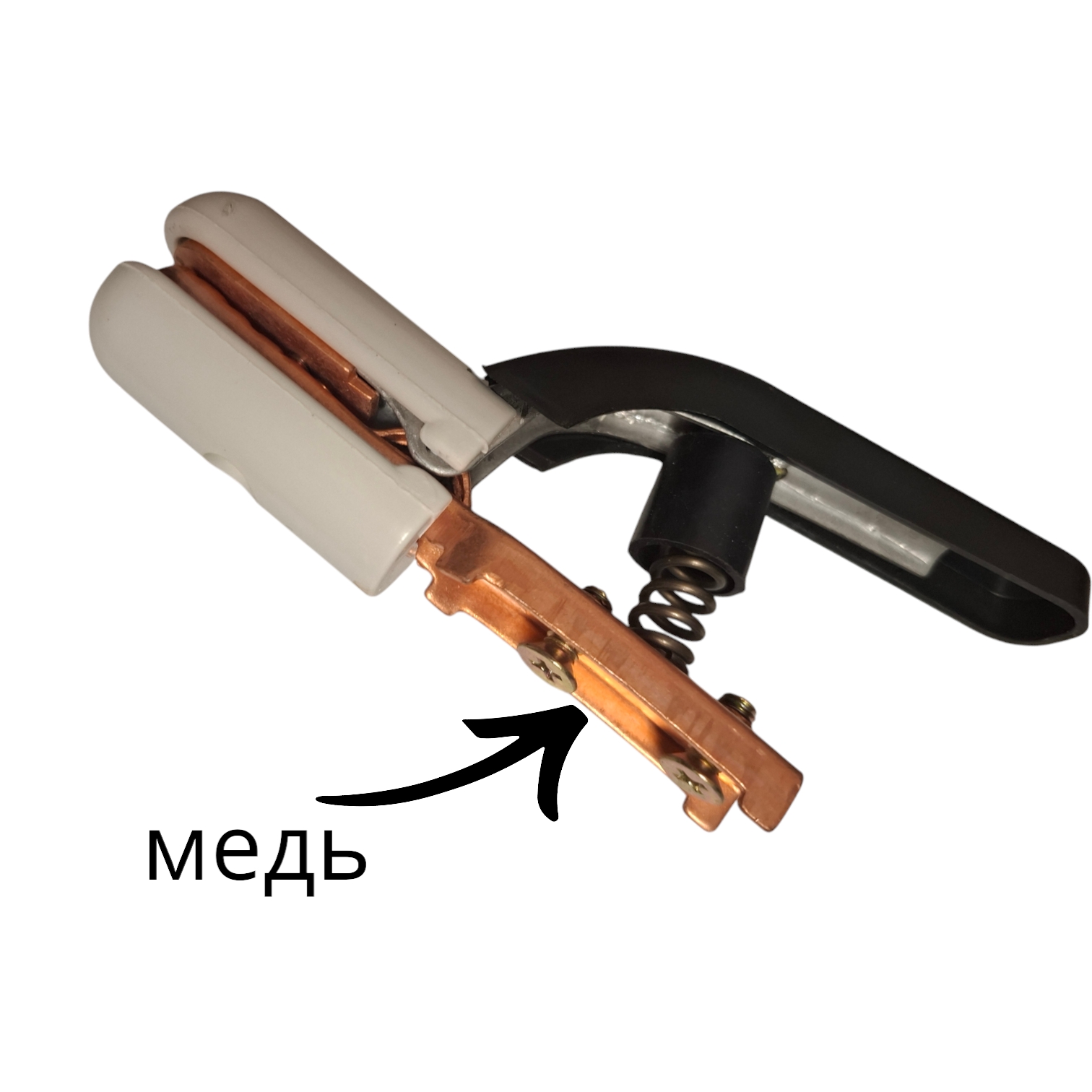 Сварочный пружинный держатель предназначен для зажима и удержания электродов с током не более 300 А. Пластиковые ручки являются изолятором, но при этом важно, чтобы электроведущие части держателя не соприкасались со свариваемым изделием или руками человека.
