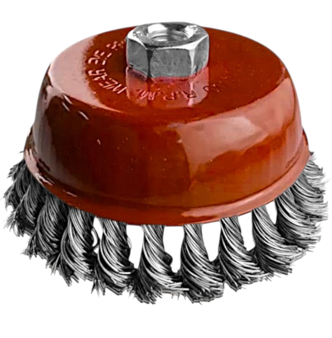 Щетка-крацовка чашечная для УШМ 150 мм предназначена для зачистки поверхностей от лакокрасочных покрытий, ржавчины, окалины, различных стойких загрязнений, а также для зачистки сварных швов. Щетка изготовлена из стальной жгутированной проволоки. Благодаря еще более высокой жесткости сплетенного пучка и увеличенной толщине проволоки щетка обладает повышенным ресурсом. Каждая щетка-крацовка соответствует действующим стандартам качества и обеспечивает безопасную работу в указанном диапазоне оборотов до 3750 RPM. Диаметр проволоки 0.5 мм.